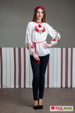 Блузка оздоблена на грудях та рукавах гарними червоними трояндами з фрагментами геометричного візерунку. Шия та рукави красиво призібрані та декоративно оброблені. Виріб добре “сидить” та гарно носиться. Чудовий молодіжний варіант який добре пасує до штанів або спідниці. Тканина; сорочкова або домоткане полотно. Вишивка: хрестик. Виготовлено в Україні з любов’ю.