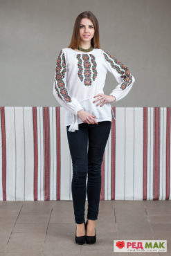 Нарядна вишита блузка із домотканого полотна багато оздоблена великою кількістю барвистої вишивки з 5 різних кольорів ниток. Красиве поєднання чорної, червоної, зеленої, жовтої та блакитної ниток створюють цікавий візуальний ефект бузкового відтінку вишиванки (хоча бузкових ниток у вишивці насправді немає). Дуже красивий та рідкісний візерунок вишиванки буде неповторно вирізняти свою власницю серед різноманіття інших любительок вишитих блуз. Будьте готові до компліментів та захоплених поглядів. Добре пасує до штанів та прямої спідниці. Тканина: домоткане полотно. Вишивка: хрестик. Виготовлено в Україні з любов’ю.