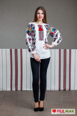 Барвиста жіноча блузка з довгим рукавом щедро вишита кольоровими квітами та геометричними елементами.