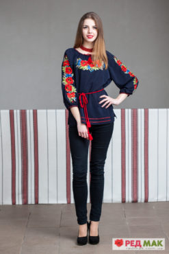 Легка жіноча вишита блузка з 3/4 рукавом виготовлена на шифоні глибокого темно-синього кольору. Прикрашена яскравим візерунком із букету польових квітів виконаним гладдю. Матерія ідеальна для теплих весняних та літніх днів. Тканина: шифон. Вишивка: гладь. Виготовлено в Україні з любов’ю.